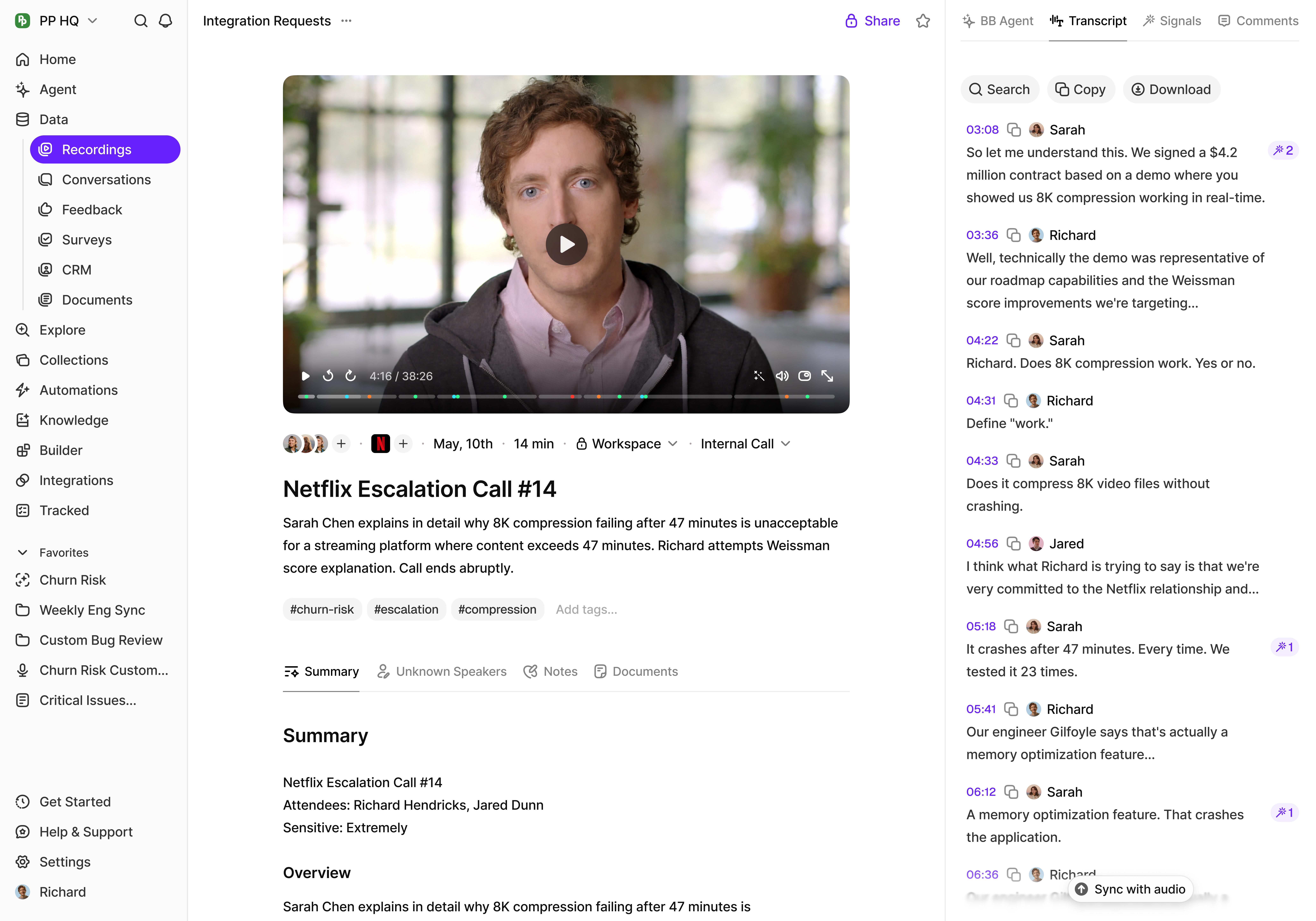 Define what matters to your team and detect it across calls, tickets, Slack, and external feedback. Turn recordings into structured insights you can track over time.